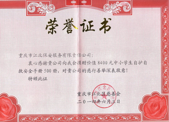 长久以来,公司在发展的同时不忘回报社会,积极关心社会公益。今年6月份公司开展了“真情献爱心,关心下一代,送书进校园”的活动,向五里店两江职教中心捐赠了500本《中小学生自救自护安全手册》,受到了职教中心师生们热烈的欢迎和由衷的感谢。由此,重庆市江北区慈善会向公司颁发了荣誉证书,对公司大力支持、热心参与社会公益的行动给予了充分的肯定。